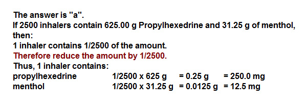 If 2500 inhalers contain a total of 625.00 g of propylhexedrine and 31.25 g of menthol, how much is contained in a single inhaler?