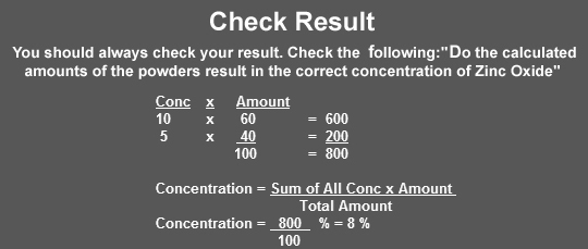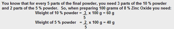 You need to prepare 100g of a powder containing 8% Zinc Oxide. You have 2 powders available; the first contains 10% Zinc Oxide; the Second contains 5% Zinc Oxide. How much of each powder do you need?