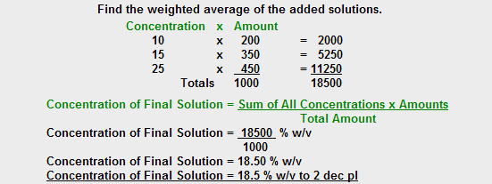 A solution is made from 200ml of 10% (w/v) Sodium Chloride solution, 350ml of 15% Sodium Chloride solution and 450ml of 25% Sodium Chloride solution. What is the concentration of the final solution? Answer to 1 decimal place.