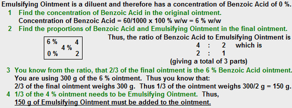 An ointment contains 60g of Benzoic Acid in 1000g of ointment. How many grams of emulsifying ointment must be added to 300g of the ointment to reduce the concentration of Benzoic Acid to 4%?