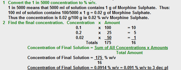 What is the percent w/v concentration of Morphine Sulphate in the solution when 100ml of 0.1% w/v Morphine Sulphate solution, 25ml of 0.2% w/v Morphine Sulphate solution and 50ml of a 1 in 5000 solution of Morphine Sulphate are mixed. Answer to 3 decimal places.