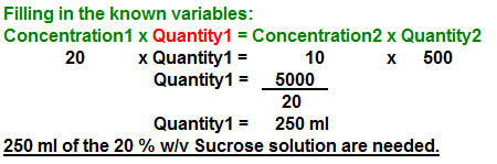 "How many millilitres of 20 % w/v Sucrose solution do you need in order to prepare 500 ml of a 10 % w/v Sucrose solution?"