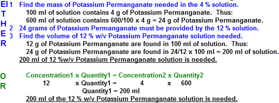 How many millilitres of 12 % w/v Potassium Permanganate do you need to prepare 600 ml of 4 % w/v Potassium Permanganate?