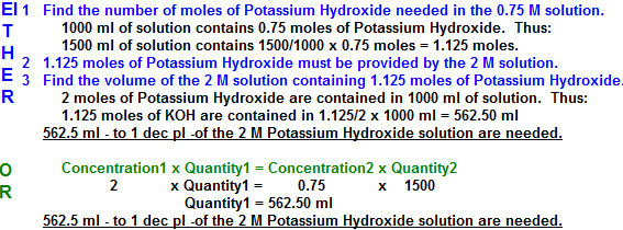 How many millilitres of 2 M Potassium Hydroxide are needed to prepare 1500 ml of 0.75 M Potassium Hydroxide? Answer to 1 decimal place.