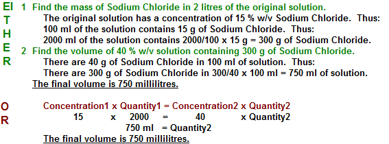 2 litres of 15 % w/v solution of Sodium Chloride is evaporated so that the final solution has a concentration of 40 % w/v. What is the volume in millilitres of the final solution?