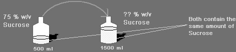 If 500 ml of a 75 % w/v aqueous solution of Sucrose are diluted to 1500 ml, what will be the new % w/v concentration of the Sucrose solution?